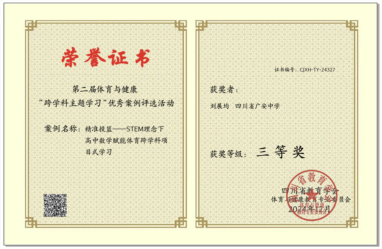 刘展均老师的案例《精准投篮——STEM理念下高中数学赋能体育跨学科项目式学习》在四川省教育学会主办的第二届体育与健康“跨学科主题学习”优秀案例评选活动中获省三等奖。本次活动共收到634篇案例,经资格审查,符合参评要求的作品519个。专委会组织专家按照公平、公正的原则,评出获奖作品383篇,其中一等奖78篇,二等奖134篇,三等奖171篇。
