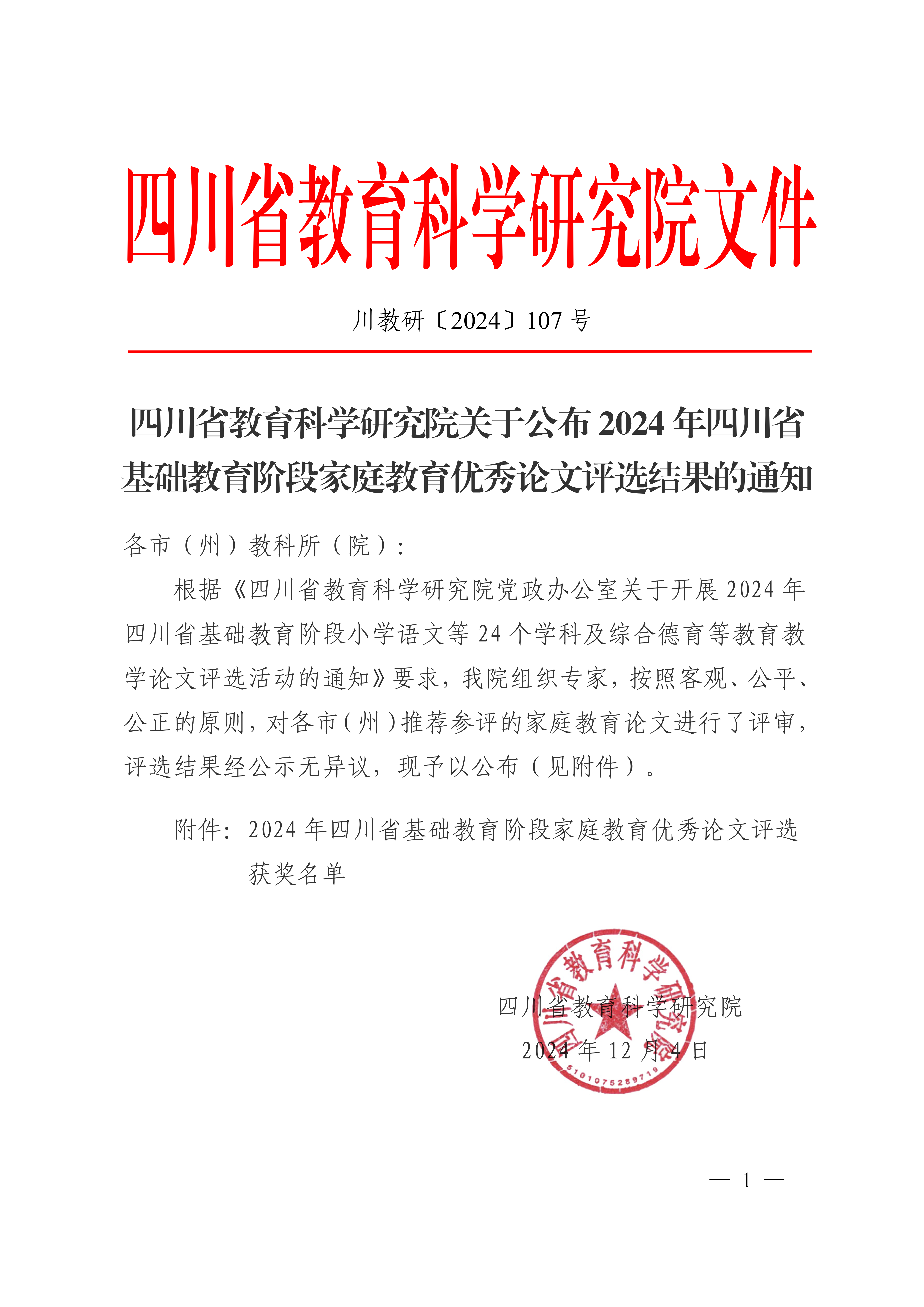 四川省教育科学研究院关于公布2024年四川省基础教育阶段家庭教育优秀论文评选结果的通知:https://scjks.net/tzgg/hdtz/content_5568