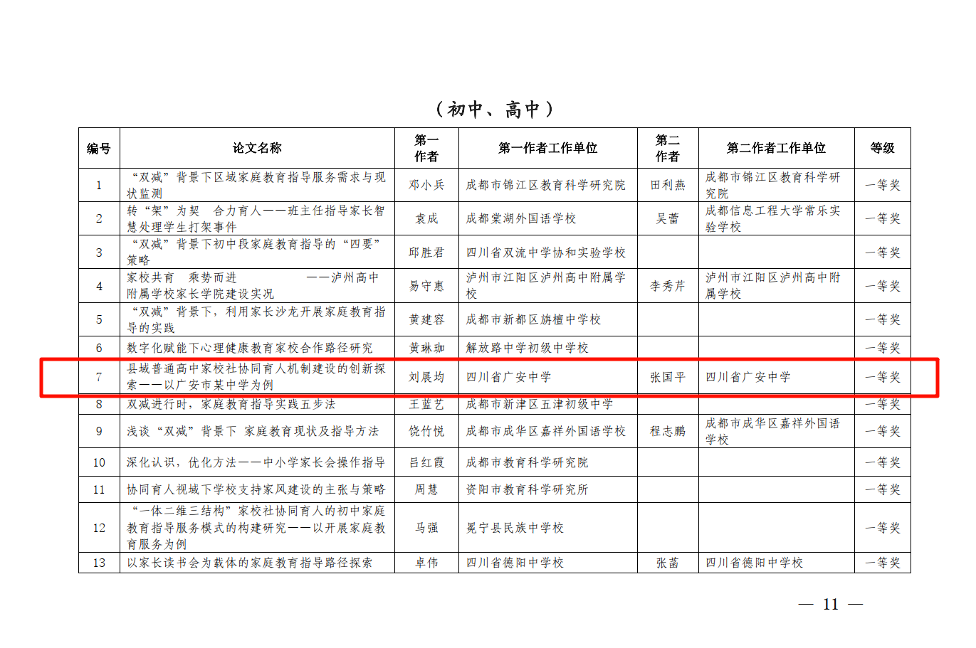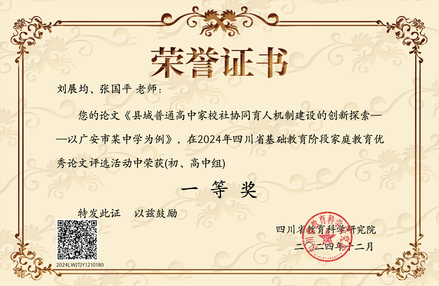 刘展均论文《县域普通高中家校社协同育人机制建设的创新探索一一以广安市某中学为例》在四川省教育科学院组织的“2024年四川省基础教育阶段家庭教育优秀论文评选”活动中获省一等奖(川教研〔2024〕107 号)。
